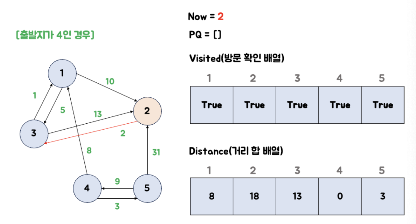 (1) 출발지 4를 우선순위 큐에 넣는다.