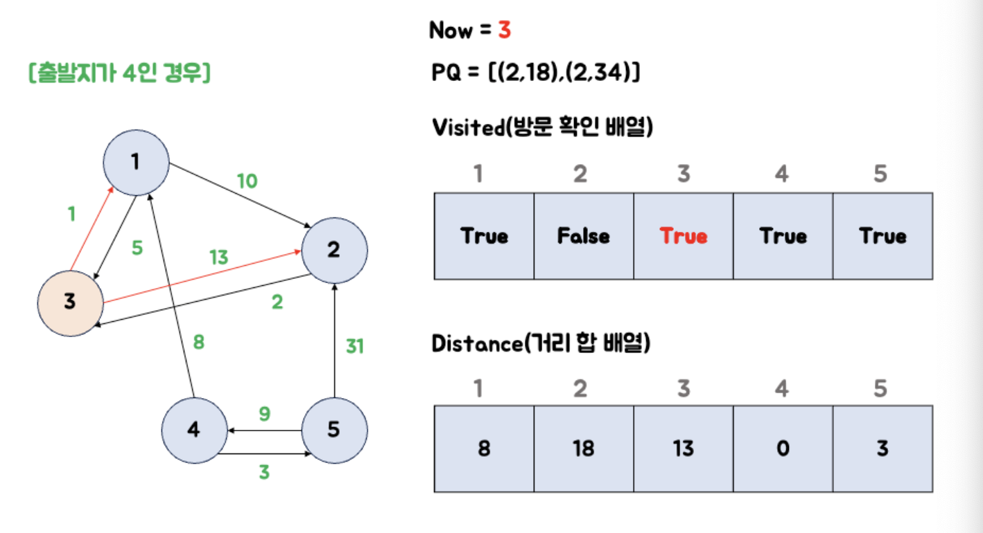 큐에서 3을 꺼냅니다. 3번 노드와 연결되어 있는 노드들의 값들을 갱신하지 않았으므로, 우선순위 큐에 넣지 않습니다.