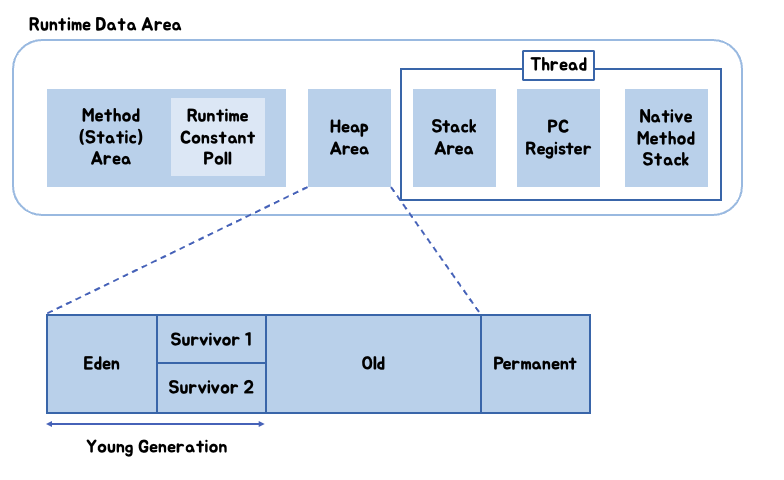 Permanent 영역은 Java 7 버전까지는 Heap Area에 함께 존재했으나, Java 8 버전부터는 Native Method Stack에 포함되었습니다.