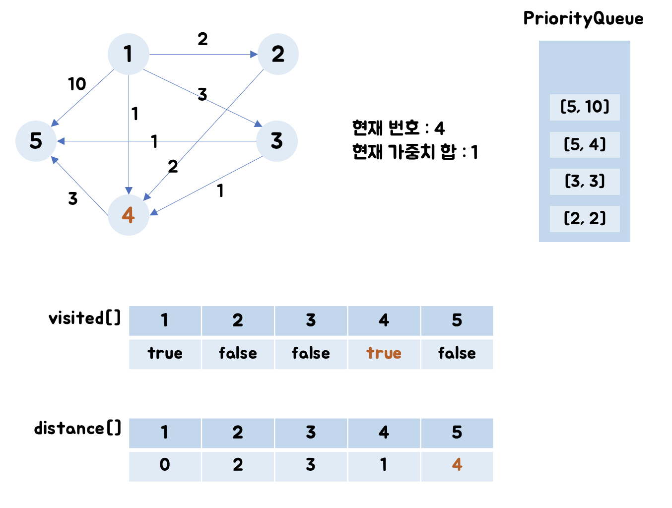 큐에서 꺼낸 번호는 4번이므로 4번과 연결된 노드들을 순회하며 가중치 합을 업데이트하고, 업데이트한 결과를 다시 큐에 삽입합니다.