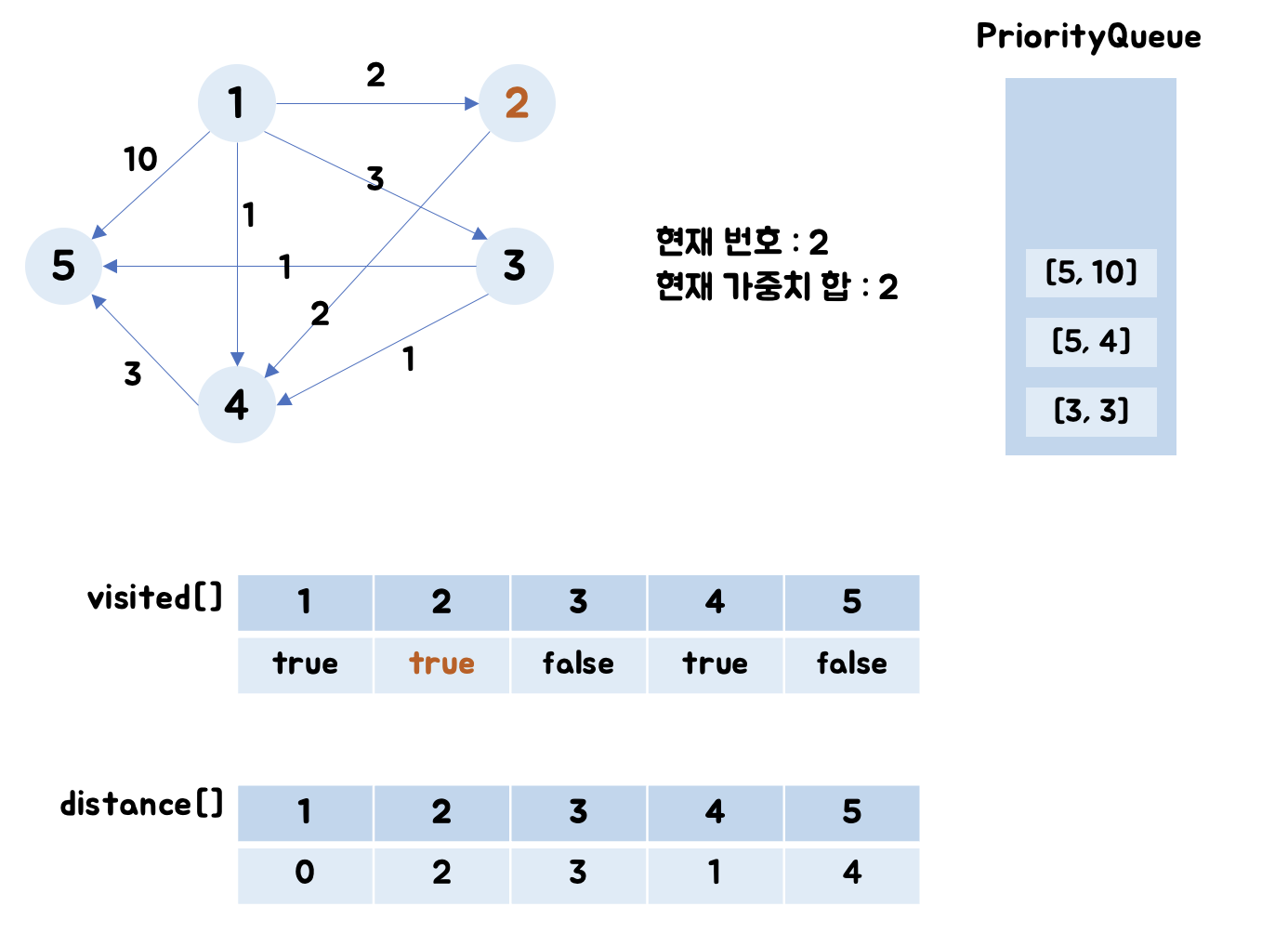 - 2번 노드 : visited[2]는 false이며, distance[2] = Integer.MAX_VALUE이므로 (0+2)로 업데이트합니다.