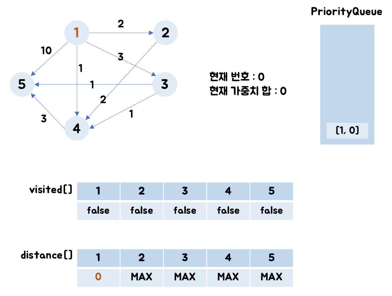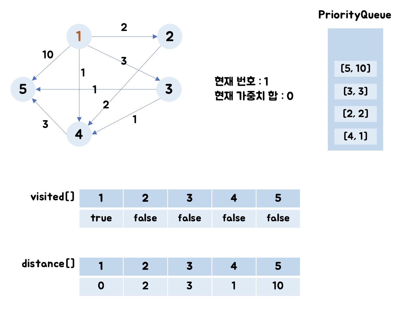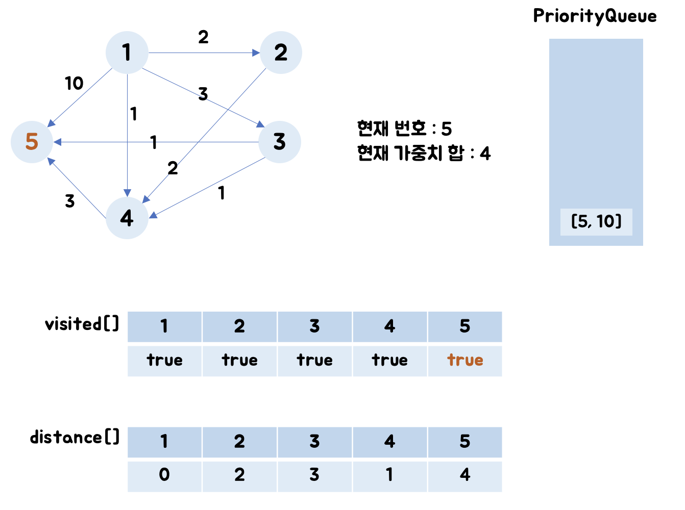 - 5번 노드 : visited[5]는 false이며, distance[5] = Integer.MAX_VALUE이므로 (0+10)로 업데이트합니다.