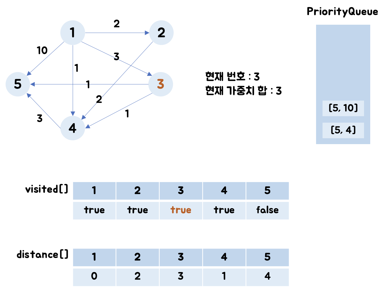- 3번 노드 : visited[3]는 false이며, distance[3] = Integer.MAX_VALUE이므로 (0+3)로 업데이트합니다.