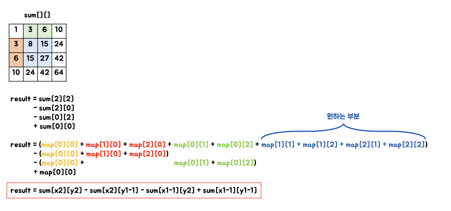 sum[i][j] = sum[i-1][j] + sum[i][j-1] - sum[i-1][j-1] + map[i][j];